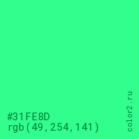 Цвет #31FE8D в цветовой модели RGB обозначается тремя октетами (49, 254, 141) в десятичном формате и #31FE8D в шестнадцатиричном (hex) формате, которые являются интенсивностью красного 49 (hex 31), интенсивность зелёного 254 (hex FE) и интенсивность синего 141 (hex 8D).