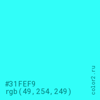 Цвет #31FEF9 в цветовой модели RGB обозначается тремя октетами (49, 254, 249) в десятичном формате и #31FEF9 в шестнадцатиричном (hex) формате, которые являются интенсивностью красного 49 (hex 31), интенсивность зелёного 254 (hex FE) и интенсивность синего 249 (hex F9).