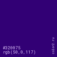 Цвет #320075 в цветовой модели RGB обозначается тремя октетами (50, 0, 117) в десятичном формате и #320075 в шестнадцатиричном (hex) формате, которые являются интенсивностью красного 50 (hex 32), интенсивность зелёного 0 (hex 00) и интенсивность синего 117 (hex 75).