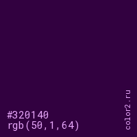Цвет #320140 в цветовой модели RGB обозначается тремя октетами (50, 1, 64) в десятичном формате и #320140 в шестнадцатиричном (hex) формате, которые являются интенсивностью красного 50 (hex 32), интенсивность зелёного 1 (hex 01) и интенсивность синего 64 (hex 40).