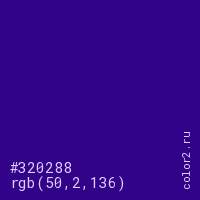 Цвет #320288 в цветовой модели RGB обозначается тремя октетами (50, 2, 136) в десятичном формате и #320288 в шестнадцатиричном (hex) формате, которые являются интенсивностью красного 50 (hex 32), интенсивность зелёного 2 (hex 02) и интенсивность синего 136 (hex 88).