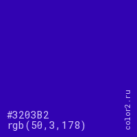 Цвет #3203B2 в цветовой модели RGB обозначается тремя октетами (50, 3, 178) в десятичном формате и #3203B2 в шестнадцатиричном (hex) формате, которые являются интенсивностью красного 50 (hex 32), интенсивность зелёного 3 (hex 03) и интенсивность синего 178 (hex B2).