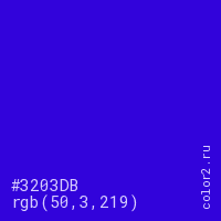 Цвет #3203DB в цветовой модели RGB обозначается тремя октетами (50, 3, 219) в десятичном формате и #3203DB в шестнадцатиричном (hex) формате, которые являются интенсивностью красного 50 (hex 32), интенсивность зелёного 3 (hex 03) и интенсивность синего 219 (hex DB).