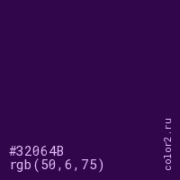Цвет #32064B в цветовой модели RGB обозначается тремя октетами (50, 6, 75) в десятичном формате и #32064B в шестнадцатиричном (hex) формате, которые являются интенсивностью красного 50 (hex 32), интенсивность зелёного 6 (hex 06) и интенсивность синего 75 (hex 4B).