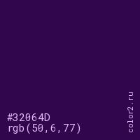 Цвет #32064D в цветовой модели RGB обозначается тремя октетами (50, 6, 77) в десятичном формате и #32064D в шестнадцатиричном (hex) формате, которые являются интенсивностью красного 50 (hex 32), интенсивность зелёного 6 (hex 06) и интенсивность синего 77 (hex 4D).