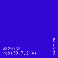 Цвет #3207D6 в цветовой модели RGB обозначается тремя октетами (50, 7, 214) в десятичном формате и #3207D6 в шестнадцатиричном (hex) формате, которые являются интенсивностью красного 50 (hex 32), интенсивность зелёного 7 (hex 07) и интенсивность синего 214 (hex D6).