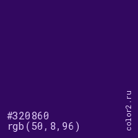 Цвет #320860 в цветовой модели RGB обозначается тремя октетами (50, 8, 96) в десятичном формате и #320860 в шестнадцатиричном (hex) формате, которые являются интенсивностью красного 50 (hex 32), интенсивность зелёного 8 (hex 08) и интенсивность синего 96 (hex 60).