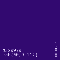 Цвет #320970 в цветовой модели RGB обозначается тремя октетами (50, 9, 112) в десятичном формате и #320970 в шестнадцатиричном (hex) формате, которые являются интенсивностью красного 50 (hex 32), интенсивность зелёного 9 (hex 09) и интенсивность синего 112 (hex 70).