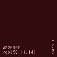 Цвет #320B0E в цветовой модели RGB обозначается тремя октетами (50, 11, 14) в десятичном формате и #320B0E в шестнадцатиричном (hex) формате, которые являются интенсивностью красного 50 (hex 32), интенсивность зелёного 11 (hex 0B) и интенсивность синего 14 (hex 0E).