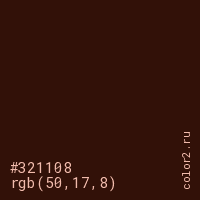 Цвет #321108 в цветовой модели RGB обозначается тремя октетами (50, 17, 8) в десятичном формате и #321108 в шестнадцатиричном (hex) формате, которые являются интенсивностью красного 50 (hex 32), интенсивность зелёного 17 (hex 11) и интенсивность синего 8 (hex 08).