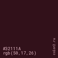 Цвет #32111A в цветовой модели RGB обозначается тремя октетами (50, 17, 26) в десятичном формате и #32111A в шестнадцатиричном (hex) формате, которые являются интенсивностью красного 50 (hex 32), интенсивность зелёного 17 (hex 11) и интенсивность синего 26 (hex 1A).