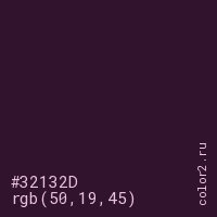 Цвет #32132D в цветовой модели RGB обозначается тремя октетами (50, 19, 45) в десятичном формате и #32132D в шестнадцатиричном (hex) формате, которые являются интенсивностью красного 50 (hex 32), интенсивность зелёного 19 (hex 13) и интенсивность синего 45 (hex 2D).