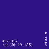 Цвет #321387 в цветовой модели RGB обозначается тремя октетами (50, 19, 135) в десятичном формате и #321387 в шестнадцатиричном (hex) формате, которые являются интенсивностью красного 50 (hex 32), интенсивность зелёного 19 (hex 13) и интенсивность синего 135 (hex 87).