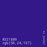 Цвет #321889 в цветовой модели RGB обозначается тремя октетами (50, 24, 137) в десятичном формате и #321889 в шестнадцатиричном (hex) формате, которые являются интенсивностью красного 50 (hex 32), интенсивность зелёного 24 (hex 18) и интенсивность синего 137 (hex 89).