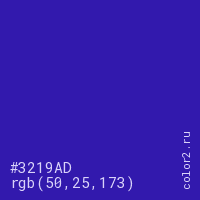 Цвет #3219AD в цветовой модели RGB обозначается тремя октетами (50, 25, 173) в десятичном формате и #3219AD в шестнадцатиричном (hex) формате, которые являются интенсивностью красного 50 (hex 32), интенсивность зелёного 25 (hex 19) и интенсивность синего 173 (hex AD).
