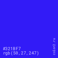 Цвет #321BF7 в цветовой модели RGB обозначается тремя октетами (50, 27, 247) в десятичном формате и #321BF7 в шестнадцатиричном (hex) формате, которые являются интенсивностью красного 50 (hex 32), интенсивность зелёного 27 (hex 1B) и интенсивность синего 247 (hex F7).