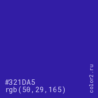 Цвет #321DA5 в цветовой модели RGB обозначается тремя октетами (50, 29, 165) в десятичном формате и #321DA5 в шестнадцатиричном (hex) формате, которые являются интенсивностью красного 50 (hex 32), интенсивность зелёного 29 (hex 1D) и интенсивность синего 165 (hex A5).