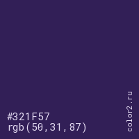 Цвет #321F57 в цветовой модели RGB обозначается тремя октетами (50, 31, 87) в десятичном формате и #321F57 в шестнадцатиричном (hex) формате, которые являются интенсивностью красного 50 (hex 32), интенсивность зелёного 31 (hex 1F) и интенсивность синего 87 (hex 57).