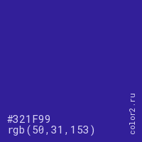 Цвет #321F99 в цветовой модели RGB обозначается тремя октетами (50, 31, 153) в десятичном формате и #321F99 в шестнадцатиричном (hex) формате, которые являются интенсивностью красного 50 (hex 32), интенсивность зелёного 31 (hex 1F) и интенсивность синего 153 (hex 99).