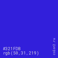 Цвет #321FDB в цветовой модели RGB обозначается тремя октетами (50, 31, 219) в десятичном формате и #321FDB в шестнадцатиричном (hex) формате, которые являются интенсивностью красного 50 (hex 32), интенсивность зелёного 31 (hex 1F) и интенсивность синего 219 (hex DB).