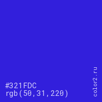 Цвет #321FDC в цветовой модели RGB обозначается тремя октетами (50, 31, 220) в десятичном формате и #321FDC в шестнадцатиричном (hex) формате, которые являются интенсивностью красного 50 (hex 32), интенсивность зелёного 31 (hex 1F) и интенсивность синего 220 (hex DC).