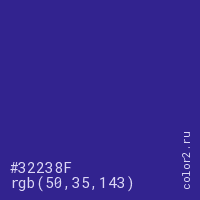 Цвет #32238F в цветовой модели RGB обозначается тремя октетами (50, 35, 143) в десятичном формате и #32238F в шестнадцатиричном (hex) формате, которые являются интенсивностью красного 50 (hex 32), интенсивность зелёного 35 (hex 23) и интенсивность синего 143 (hex 8F).