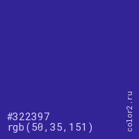 Цвет #322397 в цветовой модели RGB обозначается тремя октетами (50, 35, 151) в десятичном формате и #322397 в шестнадцатиричном (hex) формате, которые являются интенсивностью красного 50 (hex 32), интенсивность зелёного 35 (hex 23) и интенсивность синего 151 (hex 97).