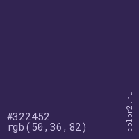 Цвет #322452 в цветовой модели RGB обозначается тремя октетами (50, 36, 82) в десятичном формате и #322452 в шестнадцатиричном (hex) формате, которые являются интенсивностью красного 50 (hex 32), интенсивность зелёного 36 (hex 24) и интенсивность синего 82 (hex 52).