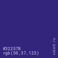 Цвет #32257B в цветовой модели RGB обозначается тремя октетами (50, 37, 123) в десятичном формате и #32257B в шестнадцатиричном (hex) формате, которые являются интенсивностью красного 50 (hex 32), интенсивность зелёного 37 (hex 25) и интенсивность синего 123 (hex 7B).