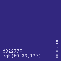 Цвет #32277F в цветовой модели RGB обозначается тремя октетами (50, 39, 127) в десятичном формате и #32277F в шестнадцатиричном (hex) формате, которые являются интенсивностью красного 50 (hex 32), интенсивность зелёного 39 (hex 27) и интенсивность синего 127 (hex 7F).