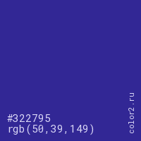 Цвет #322795 в цветовой модели RGB обозначается тремя октетами (50, 39, 149) в десятичном формате и #322795 в шестнадцатиричном (hex) формате, которые являются интенсивностью красного 50 (hex 32), интенсивность зелёного 39 (hex 27) и интенсивность синего 149 (hex 95).