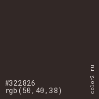 Цвет #322826 в цветовой модели RGB обозначается тремя октетами (50, 40, 38) в десятичном формате и #322826 в шестнадцатиричном (hex) формате, которые являются интенсивностью красного 50 (hex 32), интенсивность зелёного 40 (hex 28) и интенсивность синего 38 (hex 26).