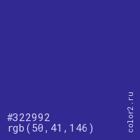 Цвет #322992 в цветовой модели RGB обозначается тремя октетами (50, 41, 146) в десятичном формате и #322992 в шестнадцатиричном (hex) формате, которые являются интенсивностью красного 50 (hex 32), интенсивность зелёного 41 (hex 29) и интенсивность синего 146 (hex 92).