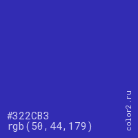 Цвет #322CB3 в цветовой модели RGB обозначается тремя октетами (50, 44, 179) в десятичном формате и #322CB3 в шестнадцатиричном (hex) формате, которые являются интенсивностью красного 50 (hex 32), интенсивность зелёного 44 (hex 2C) и интенсивность синего 179 (hex B3).