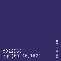 Цвет #322D66 в цветовой модели RGB обозначается тремя октетами (50, 45, 102) в десятичном формате и #322D66 в шестнадцатиричном (hex) формате, которые являются интенсивностью красного 50 (hex 32), интенсивность зелёного 45 (hex 2D) и интенсивность синего 102 (hex 66).