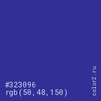 Цвет #323096 в цветовой модели RGB обозначается тремя октетами (50, 48, 150) в десятичном формате и #323096 в шестнадцатиричном (hex) формате, которые являются интенсивностью красного 50 (hex 32), интенсивность зелёного 48 (hex 30) и интенсивность синего 150 (hex 96).