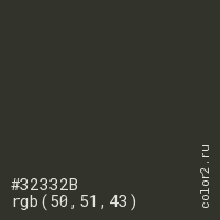 Цвет #32332B в цветовой модели RGB обозначается тремя октетами (50, 51, 43) в десятичном формате и #32332B в шестнадцатиричном (hex) формате, которые являются интенсивностью красного 50 (hex 32), интенсивность зелёного 51 (hex 33) и интенсивность синего 43 (hex 2B).