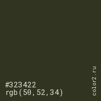 Цвет #323422 в цветовой модели RGB обозначается тремя октетами (50, 52, 34) в десятичном формате и #323422 в шестнадцатиричном (hex) формате, которые являются интенсивностью красного 50 (hex 32), интенсивность зелёного 52 (hex 34) и интенсивность синего 34 (hex 22).