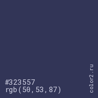 Цвет #323557 в цветовой модели RGB обозначается тремя октетами (50, 53, 87) в десятичном формате и #323557 в шестнадцатиричном (hex) формате, которые являются интенсивностью красного 50 (hex 32), интенсивность зелёного 53 (hex 35) и интенсивность синего 87 (hex 57).