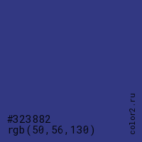 Цвет #323882 в цветовой модели RGB обозначается тремя октетами (50, 56, 130) в десятичном формате и #323882 в шестнадцатиричном (hex) формате, которые являются интенсивностью красного 50 (hex 32), интенсивность зелёного 56 (hex 38) и интенсивность синего 130 (hex 82).