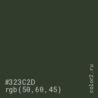 Цвет #323C2D в цветовой модели RGB обозначается тремя октетами (50, 60, 45) в десятичном формате и #323C2D в шестнадцатиричном (hex) формате, которые являются интенсивностью красного 50 (hex 32), интенсивность зелёного 60 (hex 3C) и интенсивность синего 45 (hex 2D).
