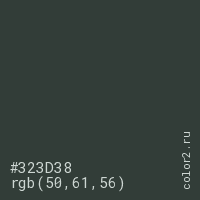Цвет #323D38 в цветовой модели RGB обозначается тремя октетами (50, 61, 56) в десятичном формате и #323D38 в шестнадцатиричном (hex) формате, которые являются интенсивностью красного 50 (hex 32), интенсивность зелёного 61 (hex 3D) и интенсивность синего 56 (hex 38).