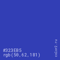 Цвет #323EB5 в цветовой модели RGB обозначается тремя октетами (50, 62, 181) в десятичном формате и #323EB5 в шестнадцатиричном (hex) формате, которые являются интенсивностью красного 50 (hex 32), интенсивность зелёного 62 (hex 3E) и интенсивность синего 181 (hex B5).
