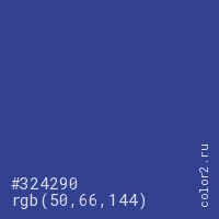 Цвет #324290 в цветовой модели RGB обозначается тремя октетами (50, 66, 144) в десятичном формате и #324290 в шестнадцатиричном (hex) формате, которые являются интенсивностью красного 50 (hex 32), интенсивность зелёного 66 (hex 42) и интенсивность синего 144 (hex 90).