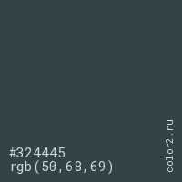 Цвет #324445 в цветовой модели RGB обозначается тремя октетами (50, 68, 69) в десятичном формате и #324445 в шестнадцатиричном (hex) формате, которые являются интенсивностью красного 50 (hex 32), интенсивность зелёного 68 (hex 44) и интенсивность синего 69 (hex 45).