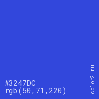 Цвет #3247DC в цветовой модели RGB обозначается тремя октетами (50, 71, 220) в десятичном формате и #3247DC в шестнадцатиричном (hex) формате, которые являются интенсивностью красного 50 (hex 32), интенсивность зелёного 71 (hex 47) и интенсивность синего 220 (hex DC).