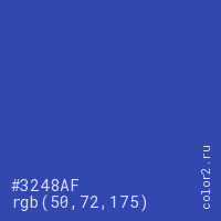 Цвет #3248AF в цветовой модели RGB обозначается тремя октетами (50, 72, 175) в десятичном формате и #3248AF в шестнадцатиричном (hex) формате, которые являются интенсивностью красного 50 (hex 32), интенсивность зелёного 72 (hex 48) и интенсивность синего 175 (hex AF).