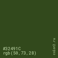 Цвет #32491C в цветовой модели RGB обозначается тремя октетами (50, 73, 28) в десятичном формате и #32491C в шестнадцатиричном (hex) формате, которые являются интенсивностью красного 50 (hex 32), интенсивность зелёного 73 (hex 49) и интенсивность синего 28 (hex 1C).