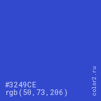 Цвет #3249CE в цветовой модели RGB обозначается тремя октетами (50, 73, 206) в десятичном формате и #3249CE в шестнадцатиричном (hex) формате, которые являются интенсивностью красного 50 (hex 32), интенсивность зелёного 73 (hex 49) и интенсивность синего 206 (hex CE).
