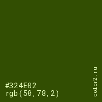 Цвет #324E02 в цветовой модели RGB обозначается тремя октетами (50, 78, 2) в десятичном формате и #324E02 в шестнадцатиричном (hex) формате, которые являются интенсивностью красного 50 (hex 32), интенсивность зелёного 78 (hex 4E) и интенсивность синего 2 (hex 02).